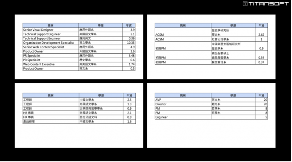 演講一開始,Tomas 直接公開了台灣科技業 4 家中大型企業的文組生就業樣貌,可觀察到職能多元,有設計師、工程師、產品負責人、公關等,其中工程師的科系囊括中文系、外文系、哲學系,顯見目前科技業的用才,對於人才背景沒有設限。