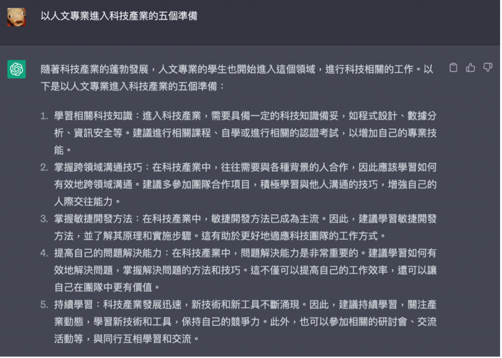那麼究竟以人文專業進入科技產業,需要做好哪些準備?Tomas 特意結合當前最夯的 AI 工具 ChatGPT,得出以下五點:學習相關科技知識、掌握跨領域溝通技巧、掌握敏捷開發方法、提高自己的問題解決能力、持續學習,Tomas 收斂為「科技運用、溝通協作、敏捷成長、問題解決、持續學習」,接著逐點深入分享如何做好準備。